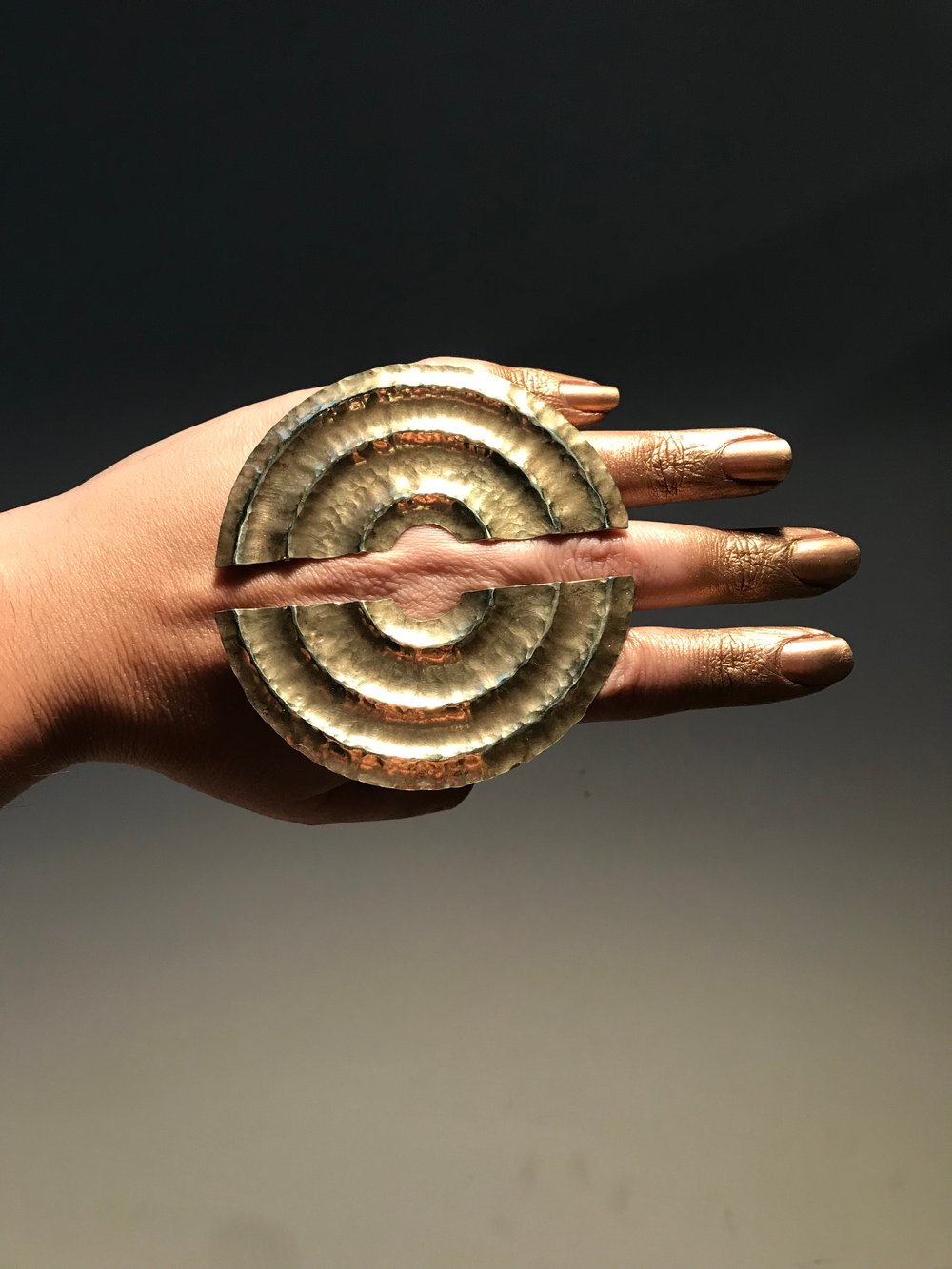 A glowing disk split in two reverses to expose sterling circles rippling out across a mottled, darkened field. Hand forged brass on a thick sterling band. This is one of a kind, a true statement ring, 3.75 inches across, a bit more work to wear but worth the effort. Approximately size 9 some adjustability.