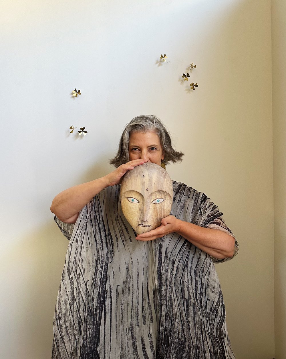 A sharp intake of breath. Carved of storm felled wood. Brass and turquoise inlay define the features, mother of pearl wanders across the face. Hard wax oil and pigment finish. Artist made hanging hardware.